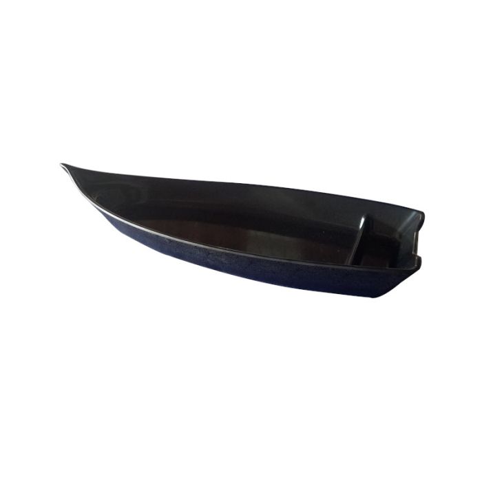 Barca in melamina di colore nero perfetta per servire in tavola sushi, è fornita di un pratico divisore interno per contenere anche salse e condimenti. La melamina è una resina termoindurente pregiata BPA-free utilizzata per la realizzazione di piatti, tazze, ciotole, bicchieri, vassoi ed altre attrezzature per la cucina e la tavola. Esteticamente somiglia alla porcellana, è estremamente leggera e resistente alla rottura, la sua superficie è lucida e liscia, robusta e solida. Sopporta temperature che vanno da -20° fino a 70°C e può essere collocata in frigorifero o nel freezer. Non assorbe gli odori ed è perfetta per essere trasportata in quanto non è fragile. Non può essere collocata a contatto con fonti di calore o utilizzata per riscaldare e preparare cibo nel forno tradizionale o a microonde. Si lava facilmente a mano con spugne non abrasive e detergenti neutri, ma può essere lavata anche in lavastoviglie. Si sconsiglia l'utilizzo di prodotti chimici, oli caldi e nel caso necessitasse di sterilizzazioni si consiglia di utilizzare acqua calda per non più di 20 minuti. La qualità della melamina è fondamentale per ottenere un prodotto sicuro e la melamina EFAY è stata testata e certificata per entrare a contatto con gli alimenti.